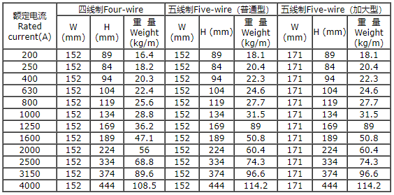 1、母线槽结构表(外型尺寸、重量):